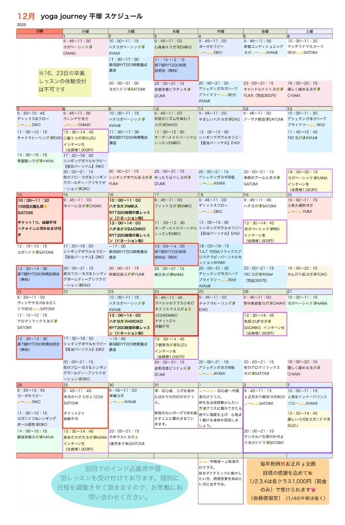 ご利用者の声 平塚店 レッスンスケジュール 二宮店 レッスンスケジュール よくある質問 エアリアルヨガの受講をご検討されている方へ ご利用者の声 初心者にもおすすめ 仕事や毎日の生活に疲れを感じていたのですが、ヨガを始てから疲れにくく少しずつ体が変化していくのを感じました。仕事終わりの夜のクラスは今日は疲れたから行くのをやめようかなと思う時もありますが、やっぱり行くと体が楽になるのが分かるので、夜の寝つきも良くなり、毎日のだるさも少し改善された感じがします。(50代・女性) 身体が硬くても始められる 運動が苦手な私でもできそうな運動を探していたところヨガと出会いました。ヨガは身体が柔らかい人がやるというイメージがあり、身体の硬い私でもできるのか少し不安でしたが、初心者でも無理のないレッスンだったのでとても楽しく行うことができました。終わった後は疲労感ではなく身体全体がスッキリした感じがしてとても気持ちよかったです。(30代・女性) 体が暖かく、体温が上がりました! 1年中体の冷えに悩まされていて、冬になるとたくさん着込んでいるのに全身の冷えから代謝も悪かったのですが、ヨガを始めてから末端冷えも改善され、たくさん着込むことが減りました。体を気持ち良く動かし、体のことも詳しく教えてくださる先生方のアドバイスもあり、ただレッスンを受けるだけではなく先生との距離も近いので質問しやすい環境も良いです。これからもよろしくお願い致します。(40代・女性) 平塚店 レッスンスケジュール 11、12月スケジュール ※スケジュールをクリックすると拡大サイズでご覧いただけます。体験レッスンは随時受付中‼️ 体験をご希望の方は、受けられたいお日にち、開始時間、レッスン名をお申込み、お問い合わせからご連絡ください。体験レッスンの受付はレッスン開始4時間前までとなります。レッスン強度🔰…身体をあまり動かない方、ヨガが初めてな方向けクラス。⭐️〜⭐️⭐️…普段からストレッチをしていたり、身体をある程度動かしたい方向けのクラス。⭐️⭐️…中級者から上級者向けのクラス。身体をダイナミックに動かしたい方、脂肪燃焼を高めたクラス。 二宮店 レッスンスケジュール 11、12月スケジュール ※スケジュールをクリックすると拡大サイズでご覧いただけます。 体験レッスンは随時受付中‼️ 体験をご希望の方は、受けられたいお日にち、開始時間、レッスン名をお申込み、お問い合わせからご連絡ください。 体験レッスンの受付はレッスン開始4時間前までとなります。レッスン強度 🔰…身体をあまり動かない方、ヨガが初めてな方向けクラス。 ⭐️〜⭐️⭐️…普段からストレッチをしていたり、身体をある程度動かしたい方向けのクラス。 ⭐️⭐️…中級者から上級者向けのクラス。身体をダイナミックに動かしたい方、脂肪燃焼を高めたクラス。 エアリアルヨガも体験可能です。 よくある質問 Q.男性でもエアリアルヨガに参加できますか? A:申し訳ございませんが、男性の方はお断りさせていただいております。通常クラスでのご参加をお願い致します。 Q.駐車場はありますか? A.平塚店:専用駐車場3台、近くにコインパーキングもあります。 二宮店:なし ※駐輪場あり 但し、スタジオから徒歩5分ぐらいに公共施設である生涯学習センターがございます。そちらの駐車場がご利用可能です。 Q.身体が硬くてもヨガはできますか? A.もちろんできます。身体が硬い方こそ伸びしろがあります。 Q:平塚店と二宮店でチケットを共有できますか? A:可能です。ただし、平塚店のチケットをお持ちの方は差額分を現金でのお支払いとなります。詳しくは直接スタッフへお尋ねください。 Q.自分に合ったレベルがわかりませんが大丈夫ですか? A.レッスンの強度は幅広く用意しております。もし、レッスン強度がご心配の方は、スケジュールにある初心者マーク🔰のあるクラスを体験レッスンにお選び下さい。 Q.どのような服装がベストですか? A.動きやすい服装が最適です。(エアリアルヨガを受講される場合は、ロングTシャツとレギンスがベストです。ゆとりのあるもの、速乾性がある生地はお控えください。) Q.何歳から通えますか? A.中学生から通えます。小学生まではキッズヨガになりますが当店ではキッズヨガは行っておりません。 Q.チケットは共有できますか? A.6回券以外の回数券は夫婦共有可能、友達やカップルでは共有できません。親子でも共有できますが(お子さんが学生の場合のみ)、たくさんレッスンを受けたいお子さんが学生の場合は学生料金のほうがお安くご利用できます。 Q.子供を連れて行ってもいいですか? A.申し訳ありませんがお子さまを連れてのご受講はお断りしております。ただし、お子さま連れも可能なクラスもあるので別途お問い合わせください。※現在は開催しておりません。 Q.ヨガマットは貸してもらえますか? A.平塚店、二宮店ともにフリーマットのご用意がございますので