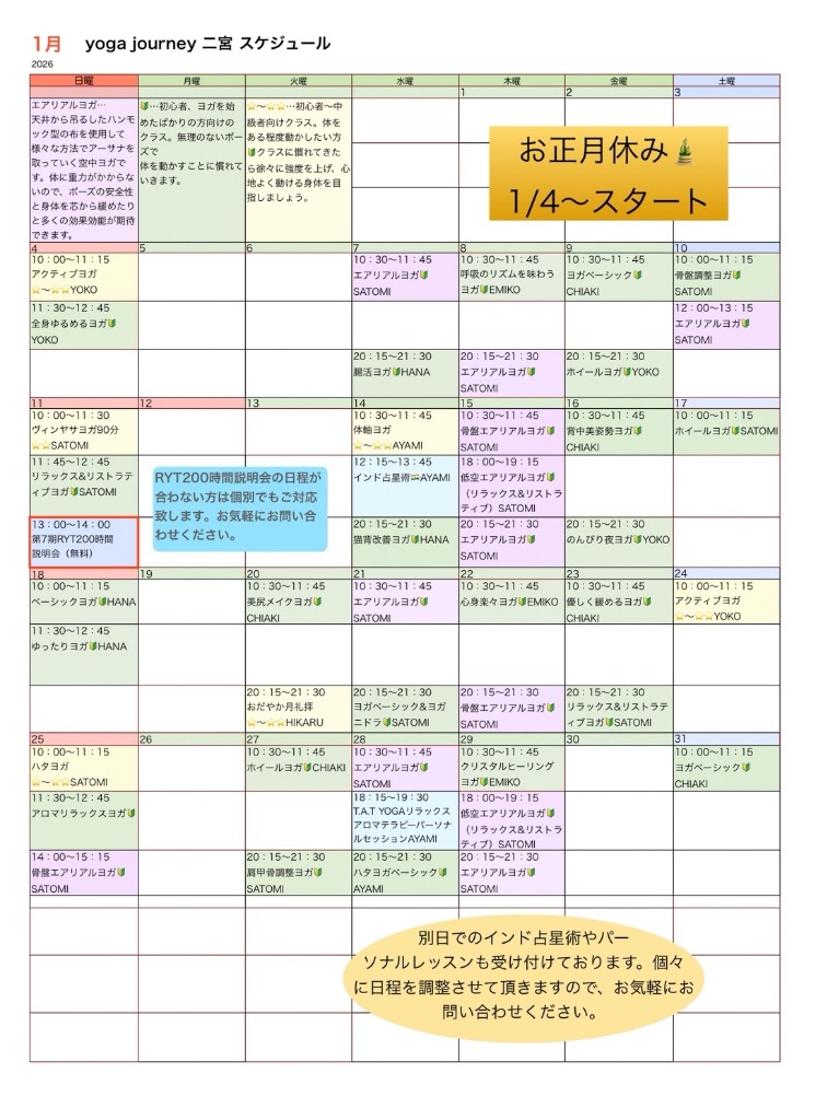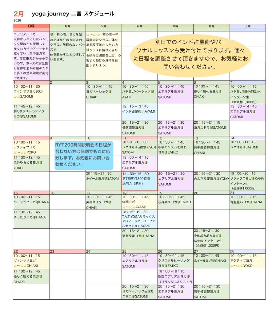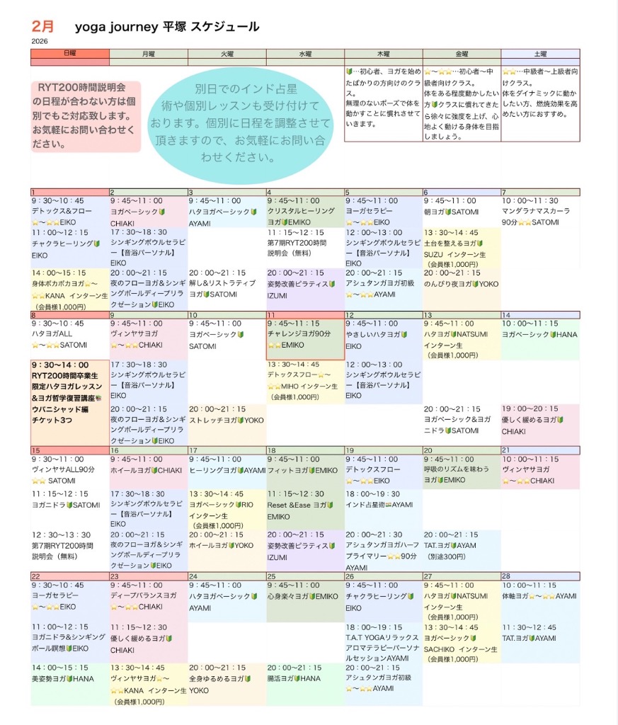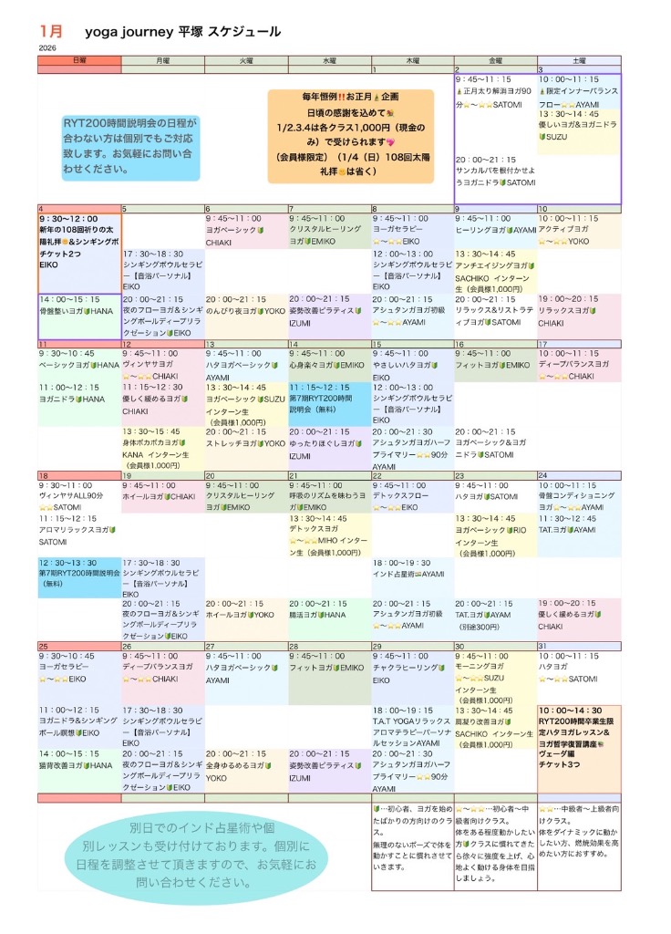 ご利用者の声 平塚店 レッスンスケジュール 二宮店 レッスンスケジュール よくある質問 エアリアルヨガの受講をご検討されている方へ ご利用者の声 初心者にもおすすめ 仕事や毎日の生活に疲れを感じていたのですが、ヨガを始てから疲れにくく少しずつ体が変化していくのを感じました。仕事終わりの夜のクラスは今日は疲れたから行くのをやめようかなと思う時もありますが、やっぱり行くと体が楽になるのが分かるので、夜の寝つきも良くなり、毎日のだるさも少し改善された感じがします。(50代・女性) 身体が硬くても始められる 運動が苦手な私でもできそうな運動を探していたところヨガと出会いました。ヨガは身体が柔らかい人がやるというイメージがあり、身体の硬い私でもできるのか少し不安でしたが、初心者でも無理のないレッスンだったのでとても楽しく行うことができました。終わった後は疲労感ではなく身体全体がスッキリした感じがしてとても気持ちよかったです。(30代・女性) 体が暖かく、体温が上がりました! 1年中体の冷えに悩まされていて、冬になるとたくさん着込んでいるのに全身の冷えから代謝も悪かったのですが、ヨガを始めてから末端冷えも改善され、たくさん着込むことが減りました。体を気持ち良く動かし、体のことも詳しく教えてくださる先生方のアドバイスもあり、ただレッスンを受けるだけではなく先生との距離も近いので質問しやすい環境も良いです。これからもよろしくお願い致します。(40代・女性) 平塚店 レッスンスケジュール 1月、2月スケジュール ※スケジュールをクリックすると拡大サイズでご覧いただけます。体験レッスンは随時受付中‼️ 体験をご希望の方は、受けられたいお日にち、開始時間、レッスン名をお申込み、お問い合わせからご連絡ください。体験レッスンの受付はレッスン開始4時間前までとなります。レッスン強度🔰…身体をあまり動かない方、ヨガが初めてな方向けクラス。⭐️〜⭐️⭐️…普段からストレッチをしていたり、身体をある程度動かしたい方向けのクラス。⭐️⭐️…中級者から上級者向けのクラス。身体をダイナミックに動かしたい方、脂肪燃焼を高めたクラス。 二宮店 レッスンスケジュール 1月、2月スケジュール ※スケジュールをクリックすると拡大サイズでご覧いただけます。 体験レッスンは随時受付中‼️ 体験をご希望の方は、受けられたいお日にち、開始時間、レッスン名をお申込み、お問い合わせからご連絡ください。 体験レッスンの受付はレッスン開始4時間前までとなります。レッスン強度 🔰…身体をあまり動かない方、ヨガが初めてな方向けクラス。 ⭐️〜⭐️⭐️…普段からストレッチをしていたり、身体をある程度動かしたい方向けのクラス。 ⭐️⭐️…中級者から上級者向けのクラス。身体をダイナミックに動かしたい方、脂肪燃焼を高めたクラス。 エアリアルヨガも体験可能です。 よくある質問 Q.男性でもエアリアルヨガに参加できますか? A:申し訳ございませんが、男性の方はお断りさせていただいております。通常クラスでのご参加をお願い致します。 Q.駐車場はありますか? A.平塚店:専用駐車場3台、近くにコインパーキングもあります。 二宮店:なし ※駐輪場あり 但し、スタジオから徒歩5分ぐらいに公共施設である生涯学習センターがございます。そちらの駐車場がご利用可能です。 Q.身体が硬くてもヨガはできますか? A.もちろんできます。身体が硬い方こそ伸びしろがあります。 Q:平塚店と二宮店でチケットを共有できますか? A:可能です。ただし、平塚店のチケットをお持ちの方は差額分を現金でのお支払いとなります。詳しくは直接スタッフへお尋ねください。 Q.自分に合ったレベルがわかりませんが大丈夫ですか? A.レッスンの強度は幅広く用意しております。もし、レッスン強度がご心配の方は、スケジュールにある初心者マーク🔰のあるクラスを体験レッスンにお選び下さい。 Q.どのような服装がベストですか? A.動きやすい服装が最適です。(エアリアルヨガを受講される場合は、ロングTシャツとレギンスがベストです。ゆとりのあるもの、速乾性がある生地はお控えください。) Q.何歳から通えますか? A.中学生から通えます。小学生まではキッズヨガになりますが当店ではキッズヨガは行っておりません。 Q.チケットは共有できますか? A.6回券以外の回数券は夫婦共有可能、友達やカップルでは共有できません。親子でも共有できますが(お子さんが学生の場合のみ)、たくさんレッスンを受けたいお子さんが学生の場合は学生料金のほうがお安くご利用できます。 Q.子供を連れて行ってもいいですか? A.申し訳ありませんがお子さまを連れてのご受講はお断りしております。ただし、お子さま連れも可能なクラスもあるので別途お問い合わせください。※現在は開催しておりません。 Q.ヨガマットは貸してもらえますか? A.平塚店、二宮店ともにフリーマットのご用意がございますの