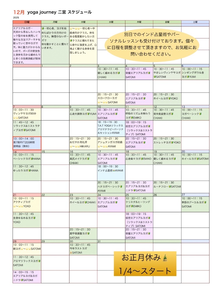 ご利用者の声 平塚店 レッスンスケジュール 二宮店 レッスンスケジュール よくある質問 エアリアルヨガの受講をご検討されている方へ ご利用者の声 初心者にもおすすめ 仕事や毎日の生活に疲れを感じていたのですが、ヨガを始てから疲れにくく少しずつ体が変化していくのを感じました。仕事終わりの夜のクラスは今日は疲れたから行くのをやめようかなと思う時もありますが、やっぱり行くと体が楽になるのが分かるので、夜の寝つきも良くなり、毎日のだるさも少し改善された感じがします。(50代・女性) 身体が硬くても始められる 運動が苦手な私でもできそうな運動を探していたところヨガと出会いました。ヨガは身体が柔らかい人がやるというイメージがあり、身体の硬い私でもできるのか少し不安でしたが、初心者でも無理のないレッスンだったのでとても楽しく行うことができました。終わった後は疲労感ではなく身体全体がスッキリした感じがしてとても気持ちよかったです。(30代・女性) 体が暖かく、体温が上がりました! 1年中体の冷えに悩まされていて、冬になるとたくさん着込んでいるのに全身の冷えから代謝も悪かったのですが、ヨガを始めてから末端冷えも改善され、たくさん着込むことが減りました。体を気持ち良く動かし、体のことも詳しく教えてくださる先生方のアドバイスもあり、ただレッスンを受けるだけではなく先生との距離も近いので質問しやすい環境も良いです。これからもよろしくお願い致します。(40代・女性) 平塚店 レッスンスケジュール 11、12月スケジュール ※スケジュールをクリックすると拡大サイズでご覧いただけます。体験レッスンは随時受付中‼️ 体験をご希望の方は、受けられたいお日にち、開始時間、レッスン名をお申込み、お問い合わせからご連絡ください。体験レッスンの受付はレッスン開始4時間前までとなります。レッスン強度🔰…身体をあまり動かない方、ヨガが初めてな方向けクラス。⭐️〜⭐️⭐️…普段からストレッチをしていたり、身体をある程度動かしたい方向けのクラス。⭐️⭐️…中級者から上級者向けのクラス。身体をダイナミックに動かしたい方、脂肪燃焼を高めたクラス。 二宮店 レッスンスケジュール 11、12月スケジュール ※スケジュールをクリックすると拡大サイズでご覧いただけます。 体験レッスンは随時受付中‼️ 体験をご希望の方は、受けられたいお日にち、開始時間、レッスン名をお申込み、お問い合わせからご連絡ください。 体験レッスンの受付はレッスン開始4時間前までとなります。レッスン強度 🔰…身体をあまり動かない方、ヨガが初めてな方向けクラス。 ⭐️〜⭐️⭐️…普段からストレッチをしていたり、身体をある程度動かしたい方向けのクラス。 ⭐️⭐️…中級者から上級者向けのクラス。身体をダイナミックに動かしたい方、脂肪燃焼を高めたクラス。 エアリアルヨガも体験可能です。 よくある質問 Q.男性でもエアリアルヨガに参加できますか? A:申し訳ございませんが、男性の方はお断りさせていただいております。通常クラスでのご参加をお願い致します。 Q.駐車場はありますか? A.平塚店:専用駐車場3台、近くにコインパーキングもあります。 二宮店:なし ※駐輪場あり 但し、スタジオから徒歩5分ぐらいに公共施設である生涯学習センターがございます。そちらの駐車場がご利用可能です。 Q.身体が硬くてもヨガはできますか? A.もちろんできます。身体が硬い方こそ伸びしろがあります。 Q:平塚店と二宮店でチケットを共有できますか? A:可能です。ただし、平塚店のチケットをお持ちの方は差額分を現金でのお支払いとなります。詳しくは直接スタッフへお尋ねください。 Q.自分に合ったレベルがわかりませんが大丈夫ですか? A.レッスンの強度は幅広く用意しております。もし、レッスン強度がご心配の方は、スケジュールにある初心者マーク🔰のあるクラスを体験レッスンにお選び下さい。 Q.どのような服装がベストですか? A.動きやすい服装が最適です。(エアリアルヨガを受講される場合は、ロングTシャツとレギンスがベストです。ゆとりのあるもの、速乾性がある生地はお控えください。) Q.何歳から通えますか? A.中学生から通えます。小学生まではキッズヨガになりますが当店ではキッズヨガは行っておりません。 Q.チケットは共有できますか? A.6回券以外の回数券は夫婦共有可能、友達やカップルでは共有できません。親子でも共有できますが(お子さんが学生の場合のみ)、たくさんレッスンを受けたいお子さんが学生の場合は学生料金のほうがお安くご利用できます。 Q.子供を連れて行ってもいいですか? A.申し訳ありませんがお子さまを連れてのご受講はお断りしております。ただし、お子さま連れも可能なクラスもあるので別途お問い合わせください。※現在は開催しておりません。 Q.ヨガマットは貸してもらえますか? A.平塚店、二宮店ともにフリーマットのご用意がございますので